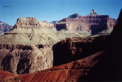 A picture of a small pack of mules climbing out the S. Kaibab below the dropoff. Our perspective was completely thrown off and we did not realize how far away the trail was until we spotted this pack.