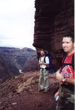 Cheech and Rob take a break on the trail as it skirts along the Tapeats Sandstone before climbing up to the Tonto Plateau. Although wide enough and very comfortable hiking, it was impossible to discern anything remotely suggesting a trail as we were descending the Kaibab and trying to figure out where we would be going on the north side.