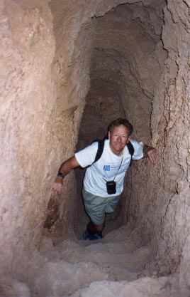 Getting to the base of Mooney Falls involves scrambling around the limestone rock formations with the aid of chains. Where that is not possible, tunnels have been carved through the solid rock. That's me heading down.