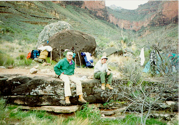 With the lightened load, it was no problem getting to the junction of the Tonto and South Bass, and we found a nice flat campsite about 50 yards west of the junction. Tom wanted to continue down and camp on the beach but the rest of us refused, wanting to save our energy for the plateau. As we were setting up camp that first night, two hikers were coming from the east, and to our delight they told us there was water in every canyon along the way. There would be no need for us to get water from the the Colorado.