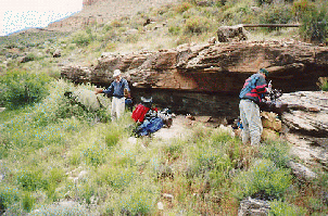 We spent the second night in Lonetree Canyon, listed as a seasonal water source and it did have water. It also rained most of the night. We set up tents at a camp site but didn't want to sit inside a tent all evening so we hiked downstream in the tapeats for about 1/4 -1/2 mile until we found an overhang where we could all gather comfortably. We had our evening meal there, and talked until way past dark when we stumbled back to our tents for the night.