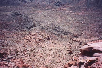 Looking down into Surprise Valley from the Redwall. The trail is plainly visible as it skirts the right side of the center hill.