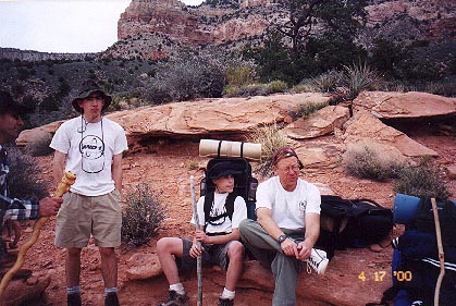 We take a breather when we hit the Esplanade. Danny is still hanging with the canyon master. It would take a few more hours before he realized the master was an idiot. Note the hiking shoes. I wore my basketball shoes on this trip. They were light and provided all the ankle support I needed.