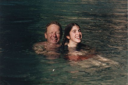 Cheech and Emily enjoy a swim in the clear waters right behind our campsite.
