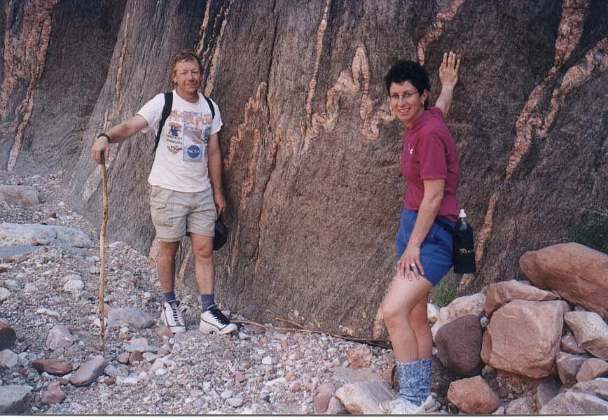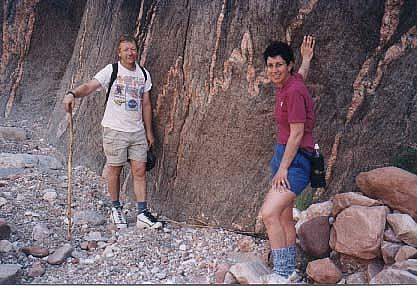 Zia and I stop a bit before the river to look at Zoroaster granite snaking through the Schist in the precambrian rock. The granite started as volcanic magma working it's way into the cracks