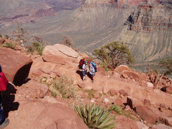 A nice shot of Emily and Jesse o the South Kaibab switchbacks with the expanse of the Canyon in the background.