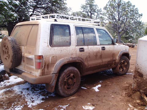 By 6am it was showing no signs of clearing. The snow continued to fall at a steady rate. By now everyone else was up and outside, talking about what to do. We would wait for the sun to come out, which it surely would, dry our stuff out, and start the hike. Hiking while it was snowing was not the issue. Having wet gear was. 10am and still snowing, noon, 2pm. By now we were in the Isuzu playing hearts and drinking scotch. It was still snowing. At about 5:30 we had to make a decision. Our gear was only getting wetter and at this point we were either going to have to pack up and head down the trail or spend another night on the rim. We had built enough time into this hike to start a day later. We debated for awhile and chose a third alternative. Head back to the village, get some hotel rooms, dry out all our gear, have a nice warm dinner and nice warm beds, and return to the trailhead bright and early the next morning to begin the hike.