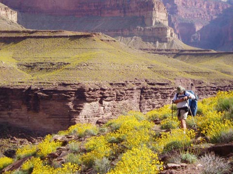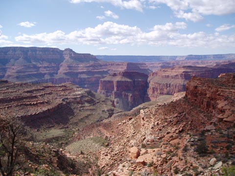 Again we made Shawn break camp and leave about an hour before the rest of us. The trail should be clearly marked we told him, and if in doubt, just go up. The distance we had to travel today was about 7 miles, but they were not easy miles. The trail climbs steadily on the east side of Bass Canyon after the junction of the Tonto, and later in the day it is sunny and hot, so we wanted to get an early start. Then it begins a steep path through the Red Wall until it levels out (relatively speaking) for a long traverse in the Supai formation. I was the last one out of the camp and didn't follow my own advice, briefly heading down the trail to the river. After maybe 5 minutes I knew I was going the wrong way, having been here at least three times before. I corrected myself and headed up. Just before the Redwall, I came upon the rest of the group. We lunched as soon as we hit the esplanade and then sent Shawn on ahead to tackle the last few miles of the trail. He was relaxing on top when we hit the trailhead of the South Bass. There was a group of men there who were getting set to hike down the South Bass the next day. They were having lunch on the rim and had a number of extra sub sandwiches they had purchased earlier in the day. They offered us the sandwiches and we gobbled them down with some cold beer we still had in the cooler in the car. Boy was that a delicious surprise. I don't think these guys realized just how good those sandwiches were to us after 5 days of dehydrated food.
