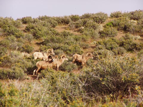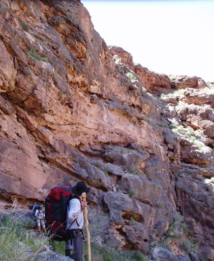 The next morning we took off and soon found a large cairn at the first drainage we came to. Accounts of which drainage to take are sketchy, and though we had planned to take the second drainage we came to, this cairn seemed so large that we decided to take it. It really didn't matter since it dropped a bit and then headed off to the west where it hooked up with the bigger drainage. Either one can be taken and you end up in the same spot within a short period of time. There was water at this point and we took a short breather. We were now in Royal Arch Creek proper and I knew that soon we would be coming to the "ledge". Eventually we came to a dropoff where cairns could be seen on either the left or right side of a spilloff. I was at the rear of the group and they took the left side. Thinking this was where we go right, I headed that way to reconoiter a bit. It soon became obvious I was on the non ledge path and I shouted across the canyon for the rest of the group to follow me. All did, except Tom, who wanted to get a closer look at the Ledge and possibly cross there. Within minutes I was high up on the right side and could watch Tom as he approached the ledge. From my vantage point maybe a hundred yards away, it looked like a shear cliff. I kept calling over to him to turn around and come our way. He insisted he could do the ledge and that from his vantage point it didn't look much better on our side. Distances are deceiving however. What he saw as a shear cliff on the right side was actually a maybe 4' wide path. Not exactly a thoroughfare but compared to what he was trying it was 5th Avenue. Once he stepped out onto the ledge I kept silent, not wanting to spook him but really hoping he would turn around. His internal frame pack is always overloaded and from my vantage point, it didn't look safe. He took the first step and paused for the longest time, maybe a minute or more. Then he stepped back and retraced his steps to join the rest of the group. The rest of us let out a sigh of relief.