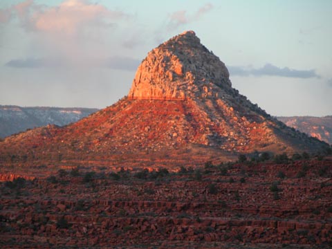 Once again Tom pulled us through and got us to the trailhead. The car was practically unrecognizable with mud caked up to the roof. We got our gear ready, and finally headed down the trail, a day later than planned. At least we were on our way. The snow was gone within minutes, even before we got to the Coconino sandstone. Hiking was cool and pleasant, and the walk to the Esplanade and the junction to the Apache trail took about an hour. Tom brought along his new toy, a really nice GPS, but since it was so new he hadn't really learned how to use it to its fullest potential. We put in a few way points, found the junction of the Apache trail, and headed west. We stopped for lunch at about 1pm and continued on, eventually camping on the Esplanade below Montezuma Point, east of the dropoff into Royal Arch drainage.