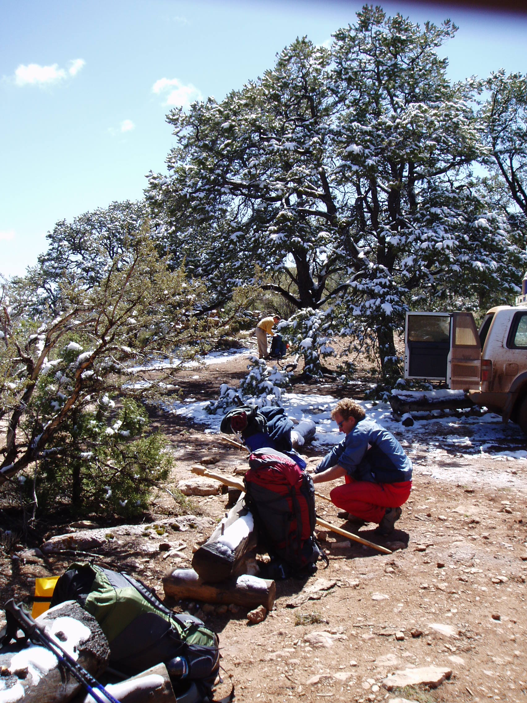 Preparing gear to finally start hike.
