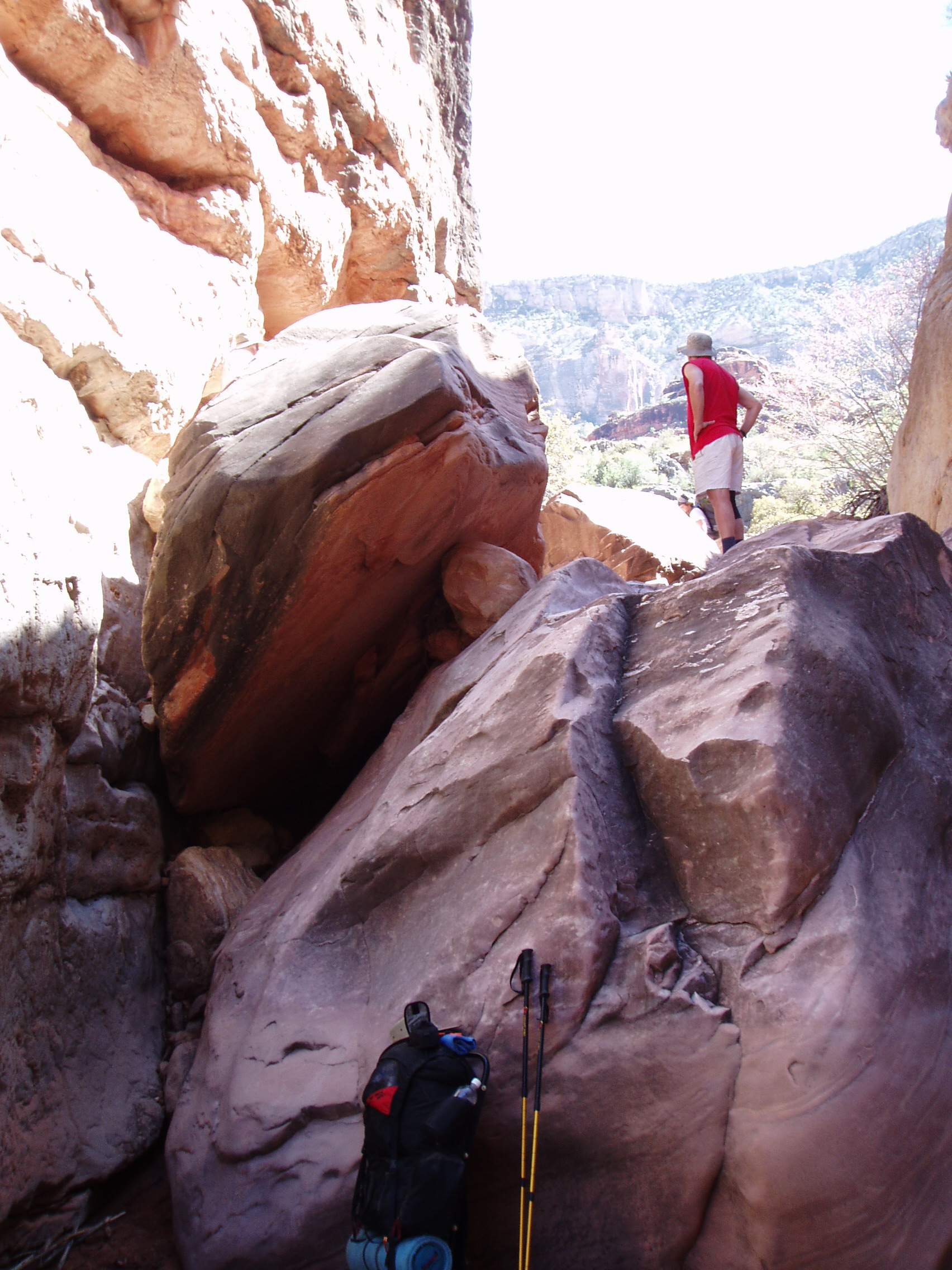 A typical obstacle in the drainage. I got there first and thought we were stuck. We had no rope. Gary comes up, takes a quick look, scrambles like a damn monkey down to the bottom. I'm still on top hands on hips, wondering how the hell he did that.