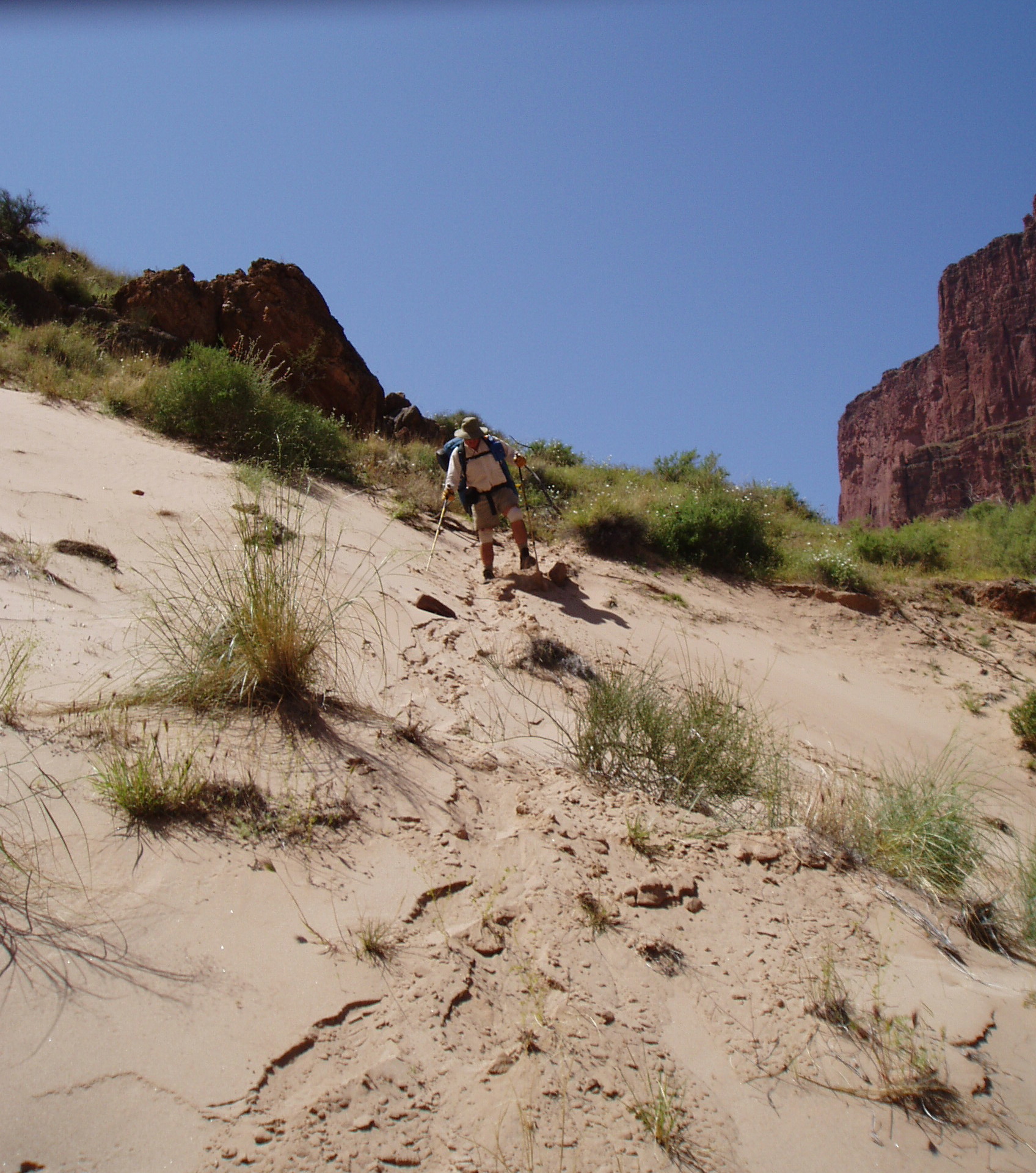 Final descent into the drainage. Sandy and slippery (and by now very hot!)