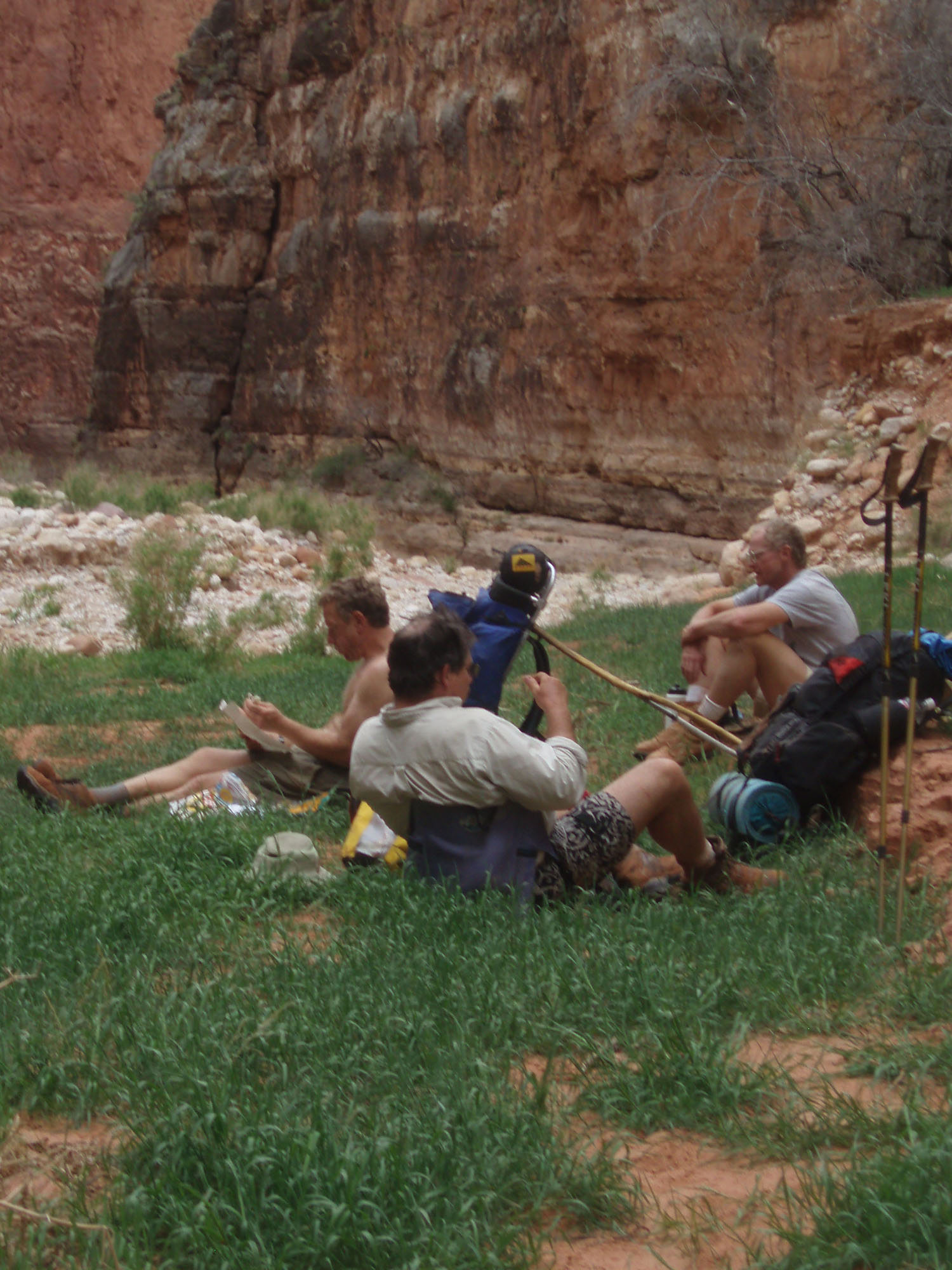We stopped at the junction of Kanab Creek and Jumpup Canyon for lunch. There is a nice campspot right above us, but the creek is dry. Cheech is checking the map. A wrong turn here and we could be going hours before we realized it, and we were running low on water