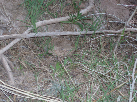 We set up camp in the Tammies to escape the sun, but later on moved to the beach to sleep. This rattler was about 15' from Gary's bag, just minding his own business. They do blend in well, don't they? It never rattled, though one I almost stepped on the next day did!