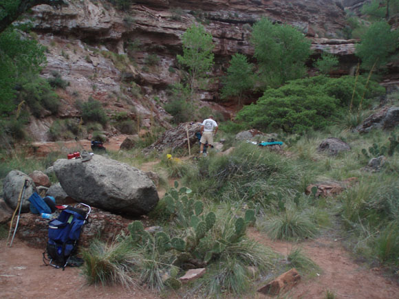 We found the campsite within about an hour of entering Kwagunt, after lot's of scrambling. There was trickling water. The falls comes over the rocks in the upper right of the picture