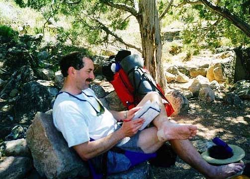 Gary, in his favorite position, as we stopped at Cottonwood Creek to rest, eat, and fill up our water bottles. He is writing in his journal. Notice the moleskin on his heel. His feet would soon be covered with it.