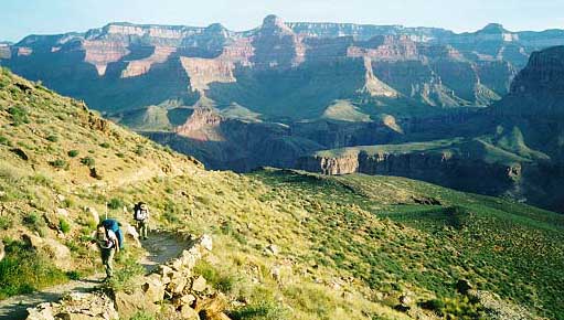 This is Tom and Gary just beginning their climb off of the Tonto Plateau on the south Kaibab. As you can see, the trail is wide and well maintained. The shadows on the rocks across the river show we got an early start. We didn't want to be hiking the Redwall in the heat of the day. We had already hiked through Cremation Canyon earlier that morning.