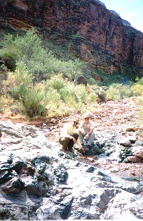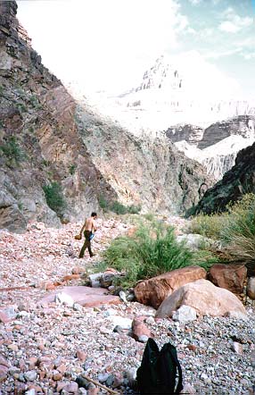 We reached Boucher creek around noon and filled up our water bottles. We also found the ruins of Bouchers cabin. There was a party of six camped at the creek. After caching the water we headed down the creek to the river. I decided to stop short of the river and just rested on the sun covered 2.4 billion year old schist, reading and writing in my journal. John and Tom reached the river. Coming back up the creek bed we paused for a moment at a major intersection we had not noticed while going downstream. Going downstream there is a large tributary coming in from the left which we just hadn't paid attention too while heading down to the river. Watch this area or you'll lose a couple of hours before you realize you've chosen the wrong branch.