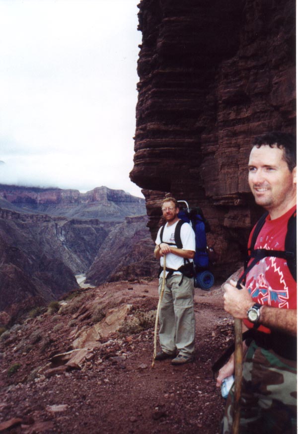 Cheech and Rob take a break on the trail as it skirts along the Tapeats Sandstone before climbing up to the Tonto Plateau. Although wide enough and very comfortable hiking, it was impossible to discern anything remotely suggesting a trail as we were descending the Kaibab and trying to figure out where we would be going on the north side.