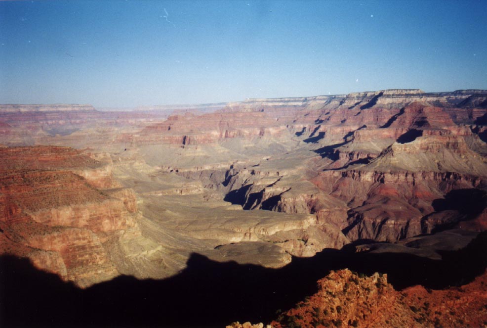 A view looking west from the S. Kaibab trail to the trail that goes to Plateau Point from Indian Gardens. It is the faint line in the middle of the picture about 1/3 the way up.