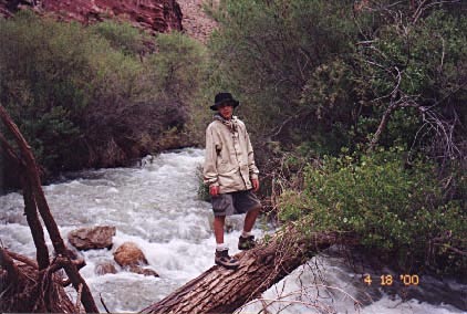 Dan Defraia stands on the log which we used to cross to the east side of Tapeats creek. Judging from the pose, standing on a narrow log above rushing water that would sweep him away in a heartbeat is something he does every day.