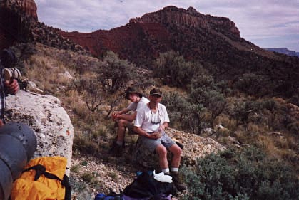 Gary and Chris stop for lunch after getting off the switchbacks and beginning the final descent onto the Esplanade..