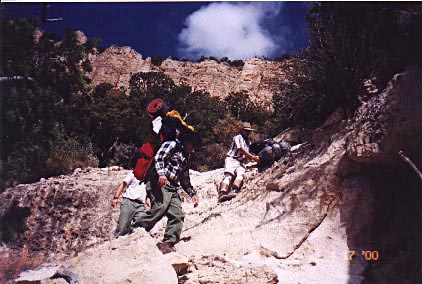 Steep dropoff. This is where a hiking buddy fell and broke some ribs a few years prior. It's much more prudent to take packs off and hand them down, as we are doing.