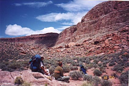 We stop to rest, have lunch, and decide whether we're going to camp above Thunder River or haul everything down to Tapeats creek. Since it was early in the day, we eventually kept going. In this photo, Tom and Cheech ponder the Redwall.