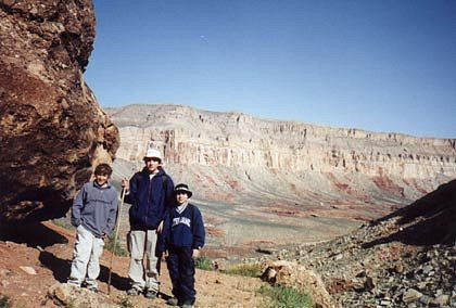 Tony, Garrett and Gavin take their first rest at the bottom of the switchbacks and look at the canyon they need to hike through.