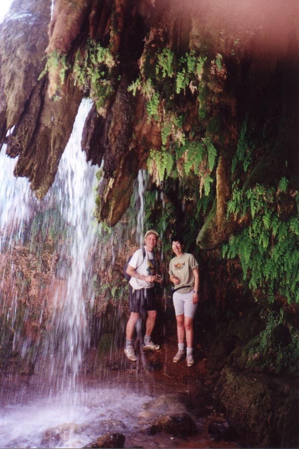 Mike and Zia in a fern lined grotto behind a small waterfall. We lost the trail for a few moments and stumbled upon this.