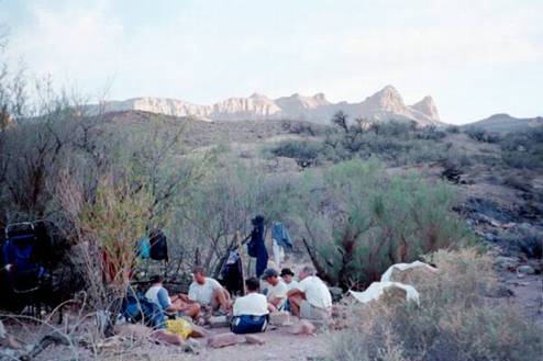 If you are doing the rim to the river in one day and leave early your time will probably be anywhere between 6 to 7 hours, depending on hiker speed. I arrived around 3:30 PM. Tom and Dan S. where already there. Later John and Cam came into camp. My father arrived around 4:30 PM, saying, “That trail kicked my ass. I will not be doing THAT again”. By 5:30 PM, Dad was getting a little worried about Cheech, who was still not in camp. Tom, Cheech’s close friend and hiking partner for many years didn’t seem worried at all. My father later told me this story: He overheard a conversation between Tom and some hikers who came in after us. Tom greeted them and asked how their trip down was. They mentioned they had seen a skeleton a ways back and Tom asked, “Hey. Did it have a blue backpack on it?” (Cheech has a blue backpack). When they said “no”, all Tom said was, “Oh…Good” and just went back about his business! Finally, Cheech arrived in camp at 6:00 P.M and told us of his difficulty with his knee.