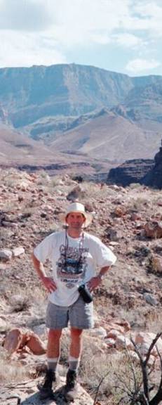 Gary on the Beamer Trail. Desert View Tower is on the rim behind, 4,600 feet up.