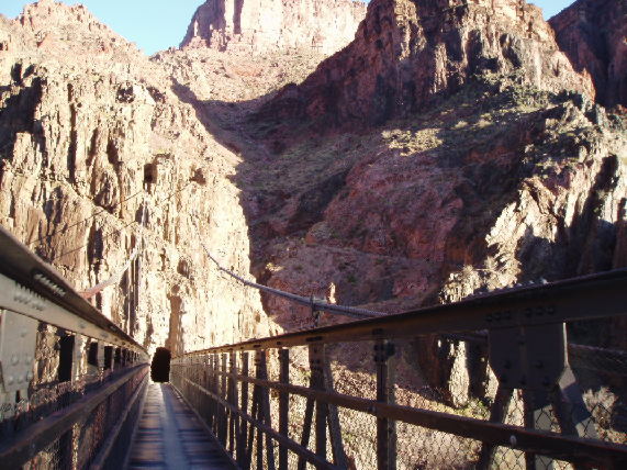 The South Kaibab suspension bridge. This is a view from the bridge, looking back to the south side. The floor is covered with heavy rubber because the mules will refuse to cross if they can look down and see water.