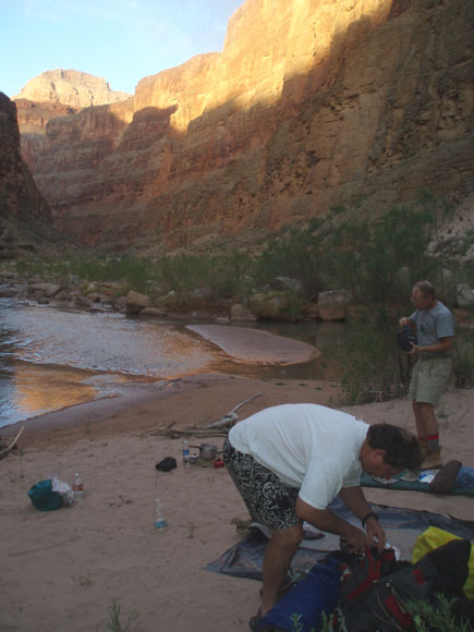 Breaking camp at the mouth of the Kanab after a great sleep! That sandbar in the center of the picture separates the Colorado on the left from the Kanab on the right. Looking west, down river.