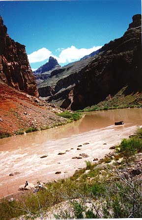 This is a view of the Colorado River at Hance Rapids looking upstream (east). It was taken from the sand dunes on the west. Notice my hiking buddies sitting on the rocks having lunch.
